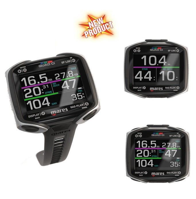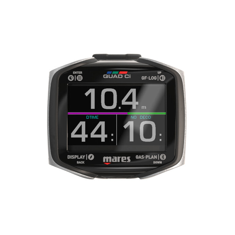 El ordenador de buceo Mares Quad CI es la herramienta perfecta para cualquier buceador. El algoritmo Bühlmann ZH-L16C permite adaptar la configuración de buceo a tus necesidades específicas. La pantalla MIP de 8 colores proporciona información completa de un vistazo, guiándote sin problemas a través de los diferentes modos de buceo, desde aire hasta nitrox y trimix. El ordenador Quad CI integrado permite la conexión a los datos de la botella mediante el transmisor opcional para una mejor monitorización durante las inmersiones. Correa elástica incluida, color negro.